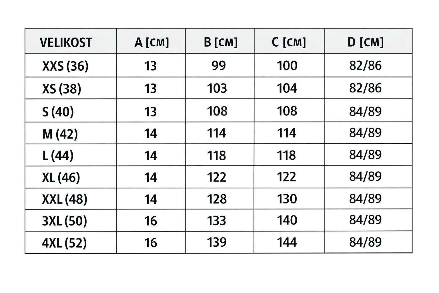 D – Délka předního dílu / zadního dílu vesty od krku dolů