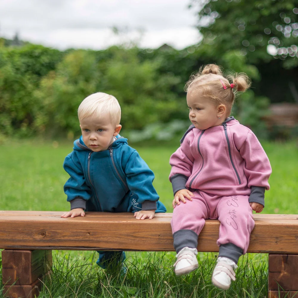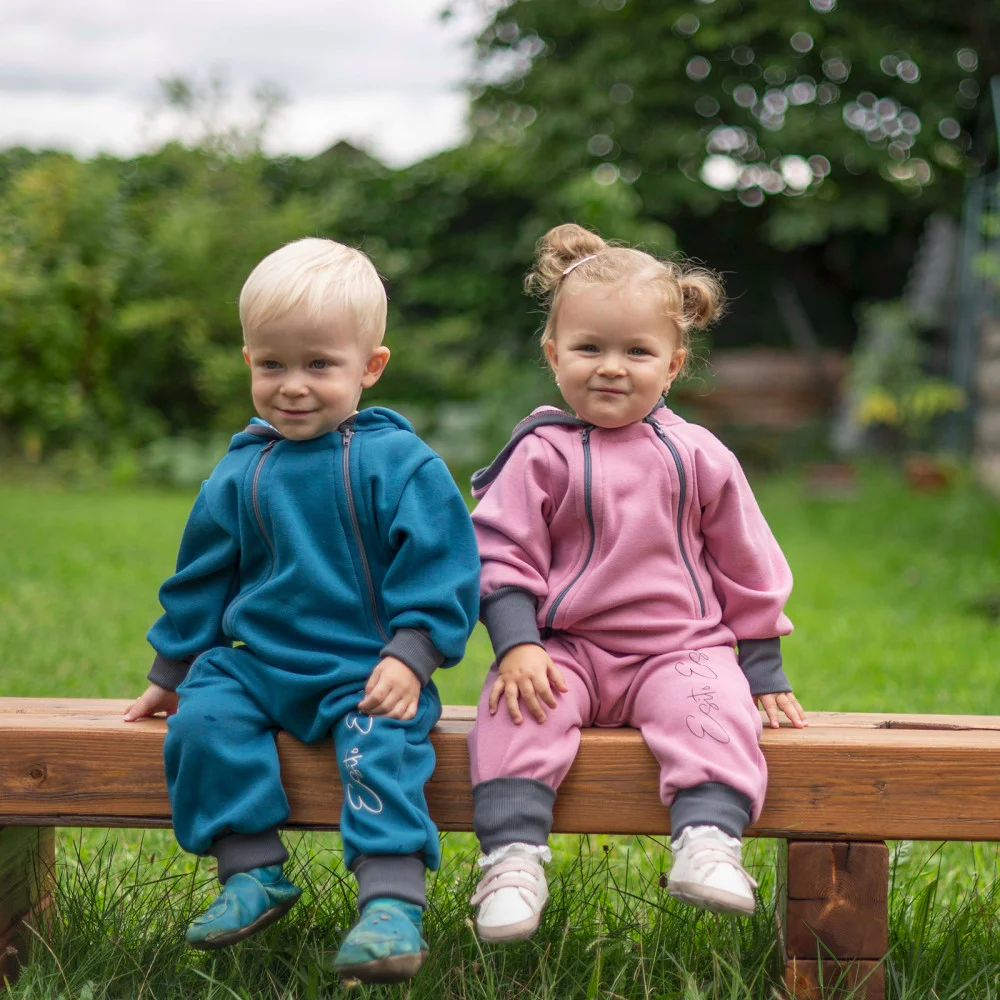 - Volný střih overalu pro volný pohyb při objevování světa. Materiál je jedinečně měkký a pružný nejen okolo zápěstí a nožiček.
