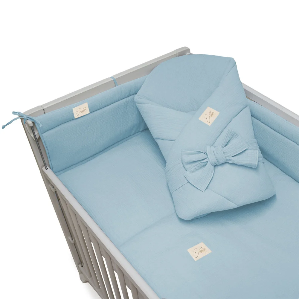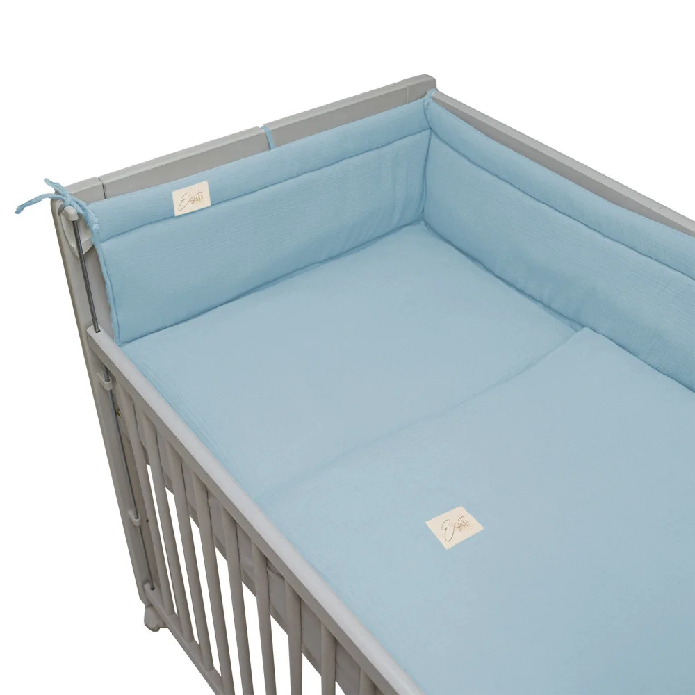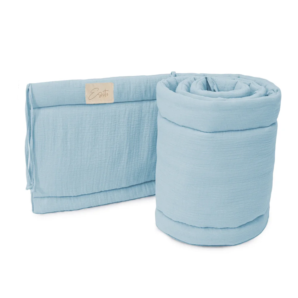 Mušelínový mantinel Blue do postýlky je oboustranný, libovolně umístitelný, měkký a zároveň držící tvar. Délka 180 cm.