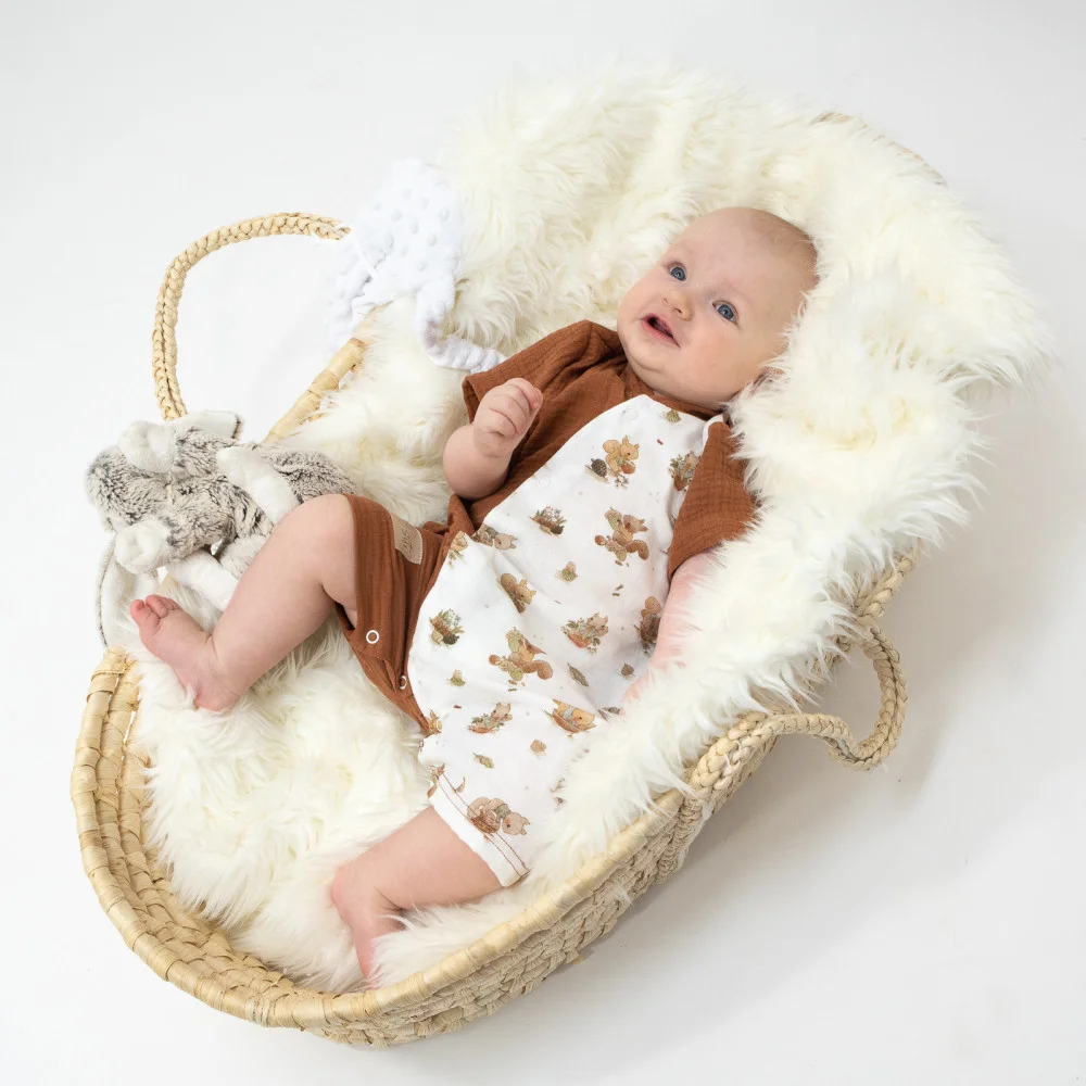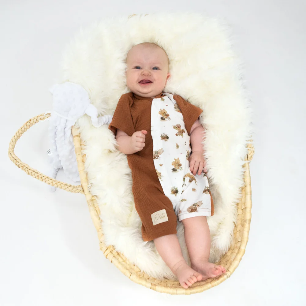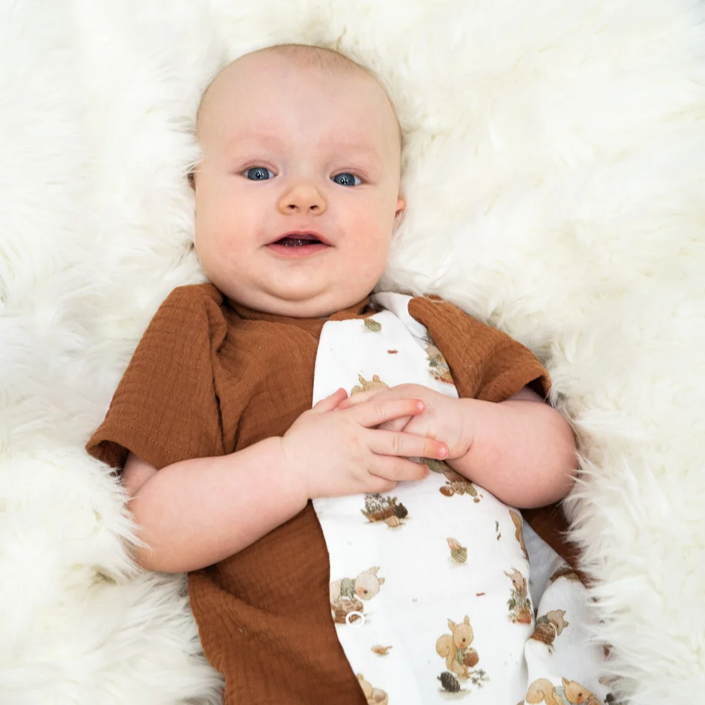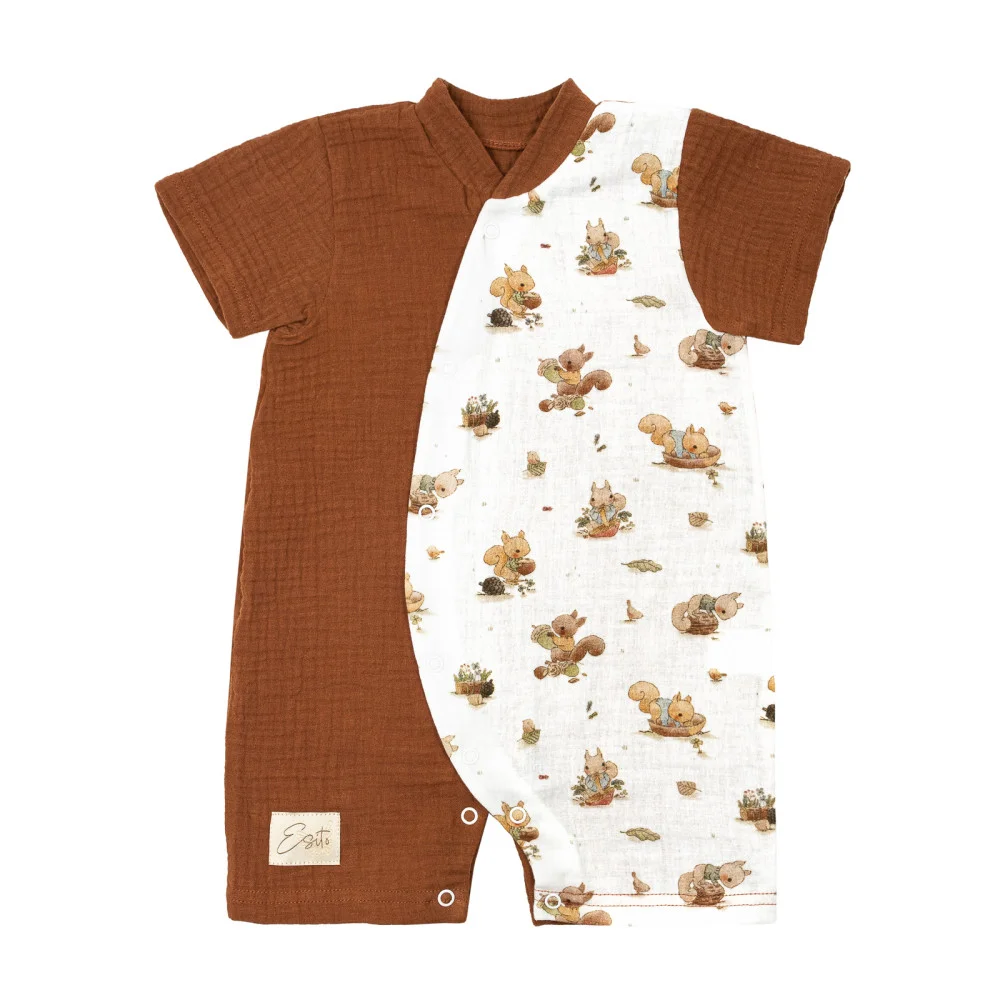 Vzdušný letní overal pro miminko Veverka z té nejlepší certifikované mušelínové bavlny GOTS. Letní overal zajistí naprostou lehkost, jemnost a prodyšnost. S láskou ručně šité letní overaly pro miminka v podhůří Orlických hor.