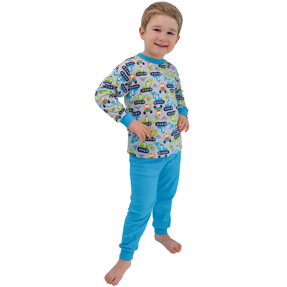 Bavlněné dětské pyžamo s potiskem Bagr je vhodné pro malé i větší chlapce. Pružný úplet okolo krku, rukávů a kotníků aby rukávy ani nohavice nikde nepřekážely. V pase má dětské pyžamo měkkou vyměnitelnou gumu. Velmi pohodlné dětské pyžamo. Díky kvalitnímu atestovanému materiálu si pyžamo drží stále stejný tvar