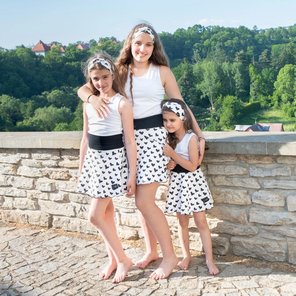 Dívčí kolová sukně Black heart nad kolena. Kolová sukně se hodí k mnoha příležitostem jako vycházky, neformální setkání, nebo i do školky, školy, prezentace, oslavy a zkoušky. Je tedy vhodná na běžné i parádní nošení. K sukýnce se hodí baleríny, ale klidně i "žabky".