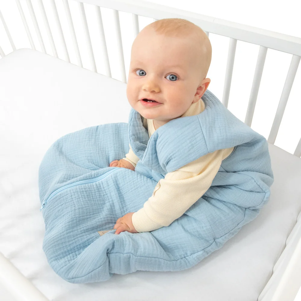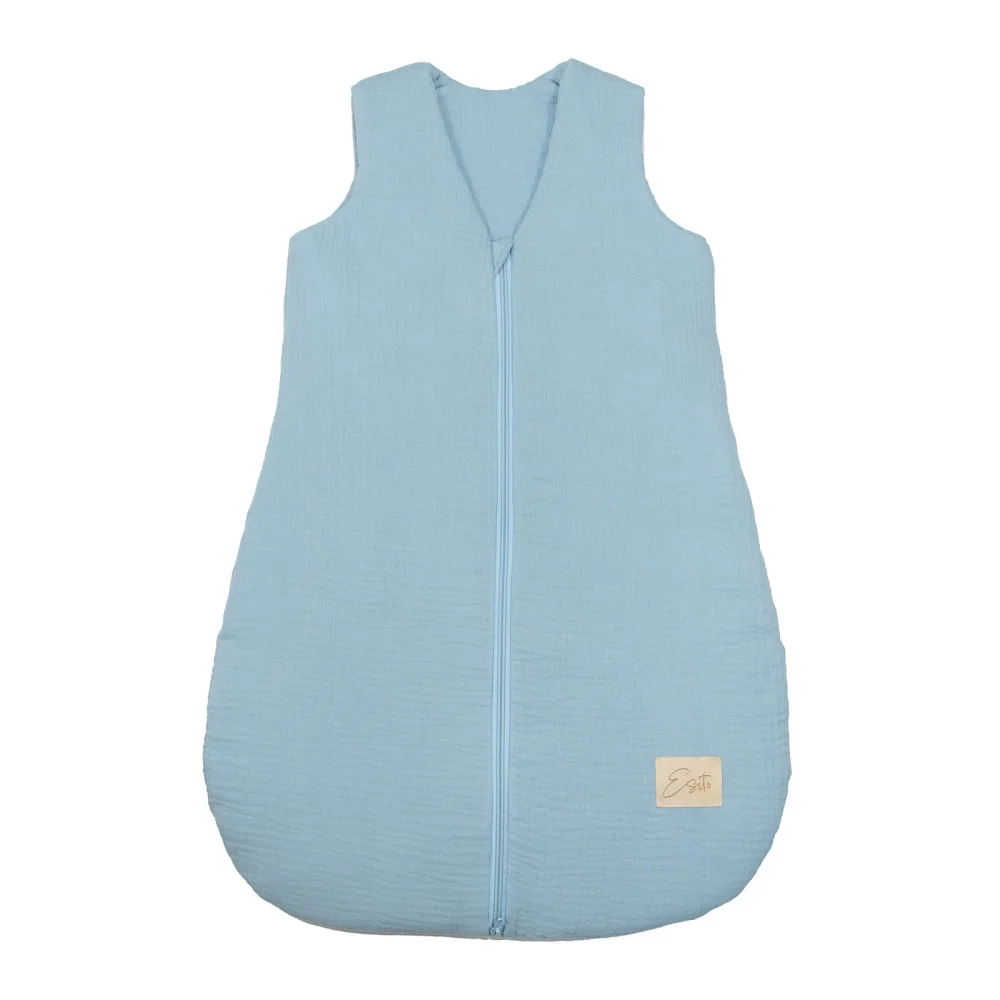 Spací pytel pro miminko Blue z prémiového mušelínu. TOG 2,5 18-21°C. Pohodlné spaní bez holých zad s volným pohybem. Spaní jako na obláčku z mušelínu.