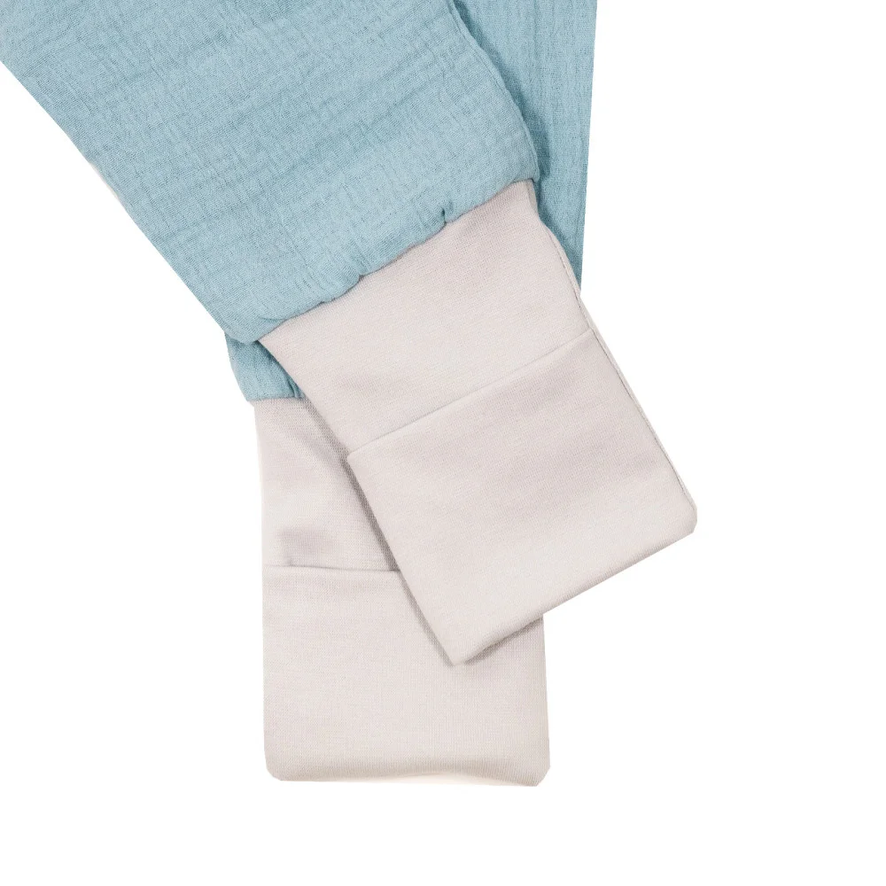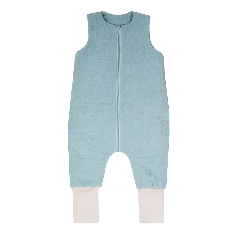 Mušelínový spací pytel s nohavicemi Blue. Ideální do teploty 24-27°C. TOG: 0.5 Perfektní volba pro malé děti s naprostou svobodou pohybu. Zajistí, že se špunti neodkopou.