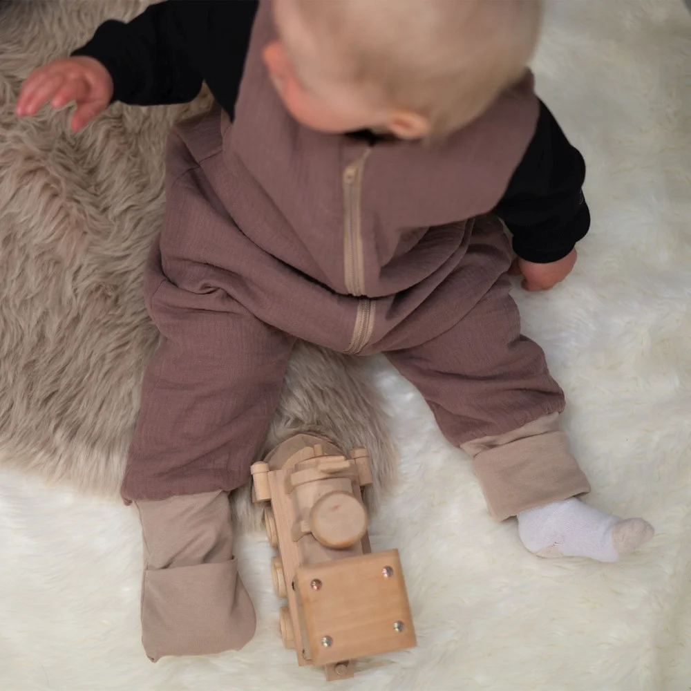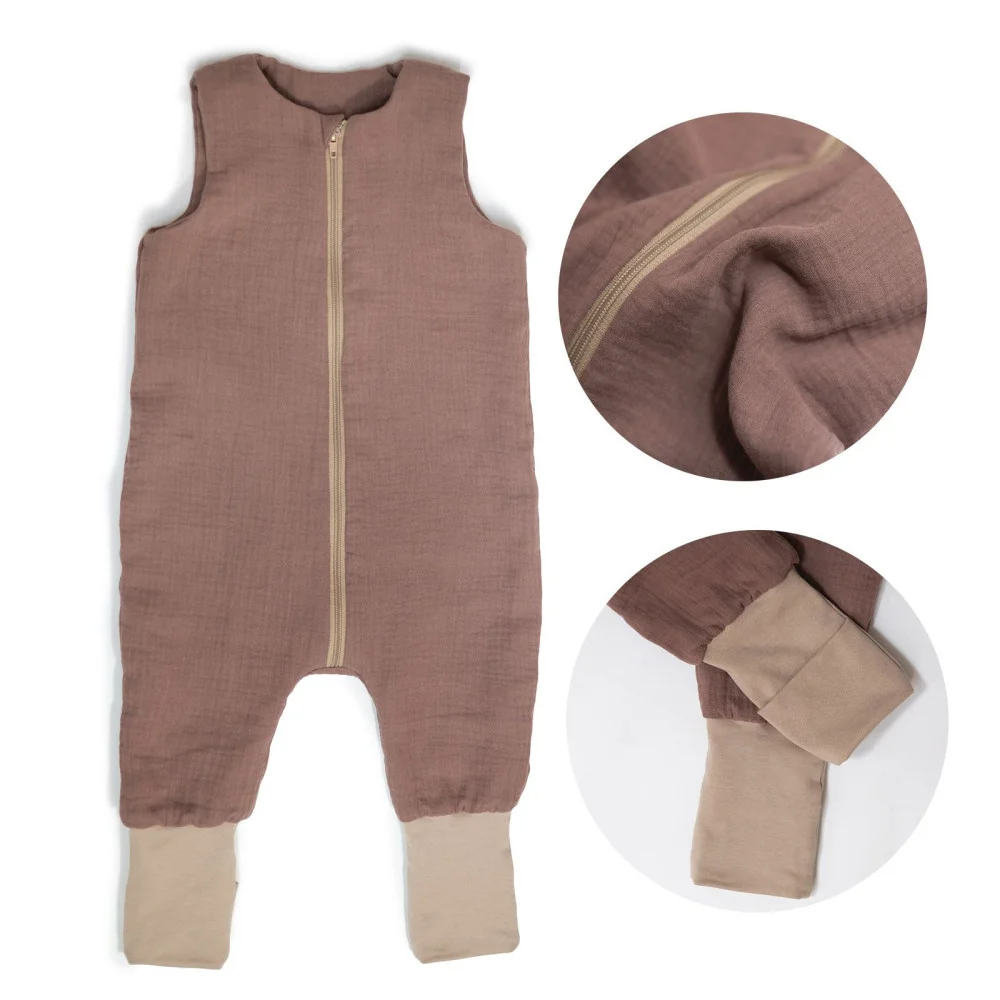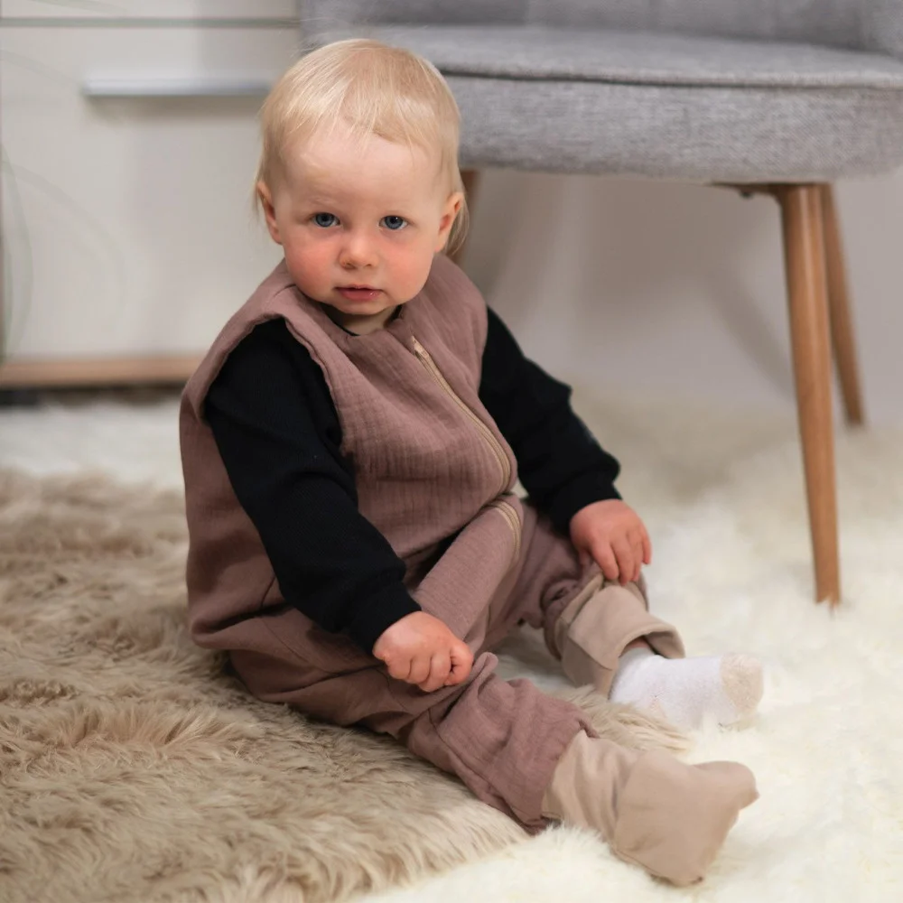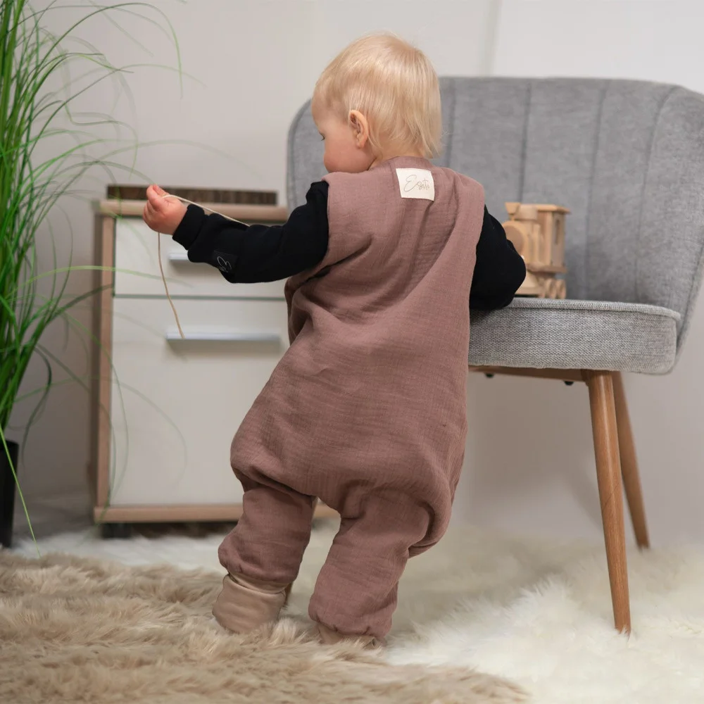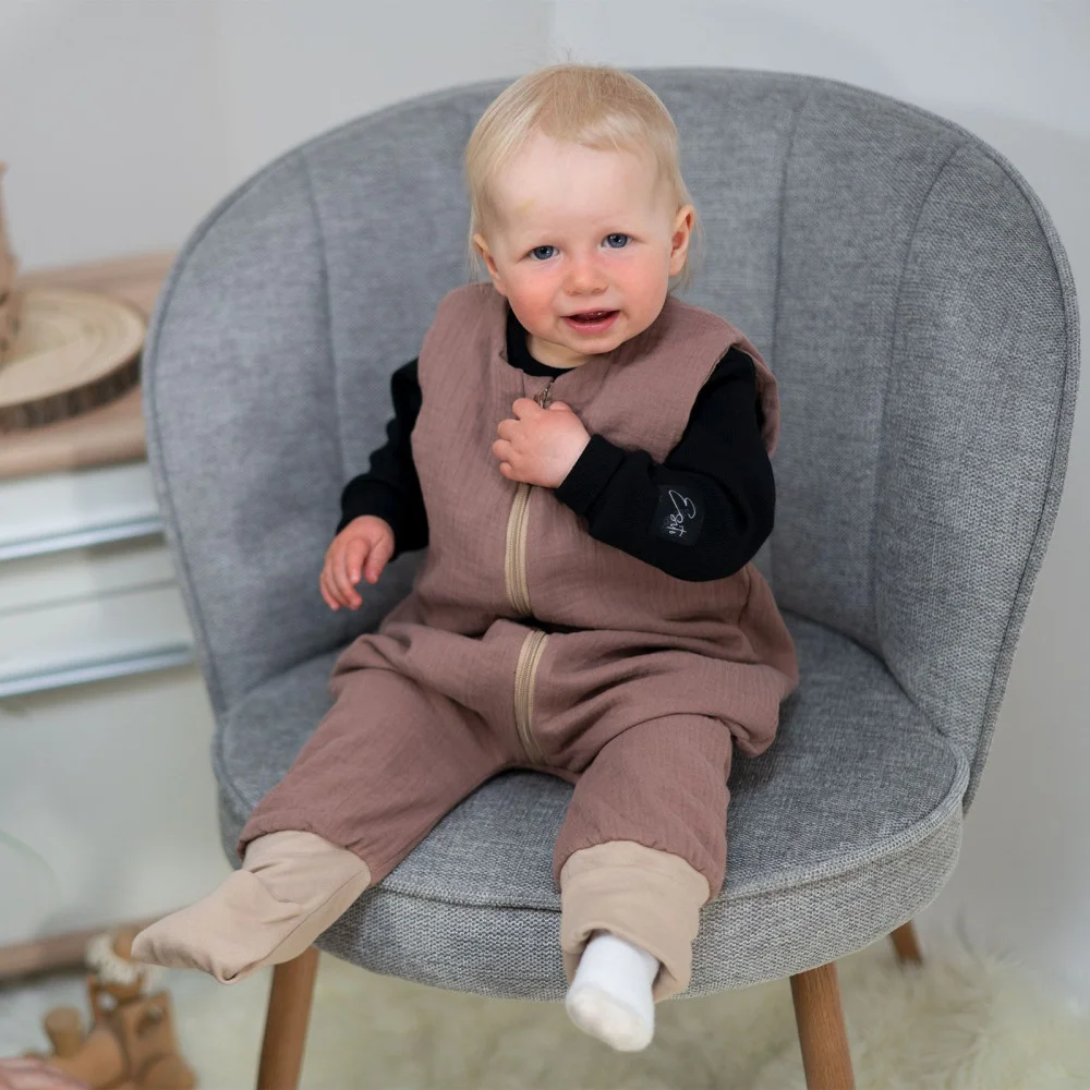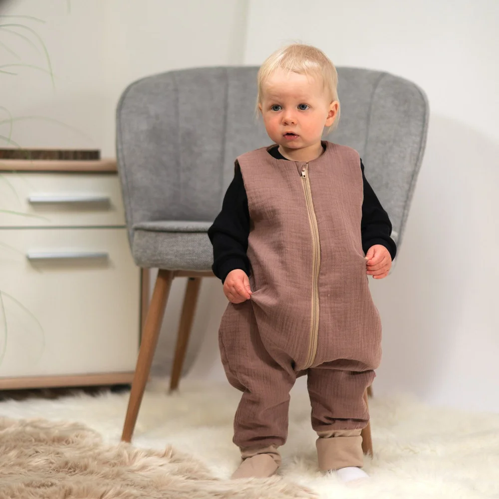 Mušelínový spací pytel s nohavicemi Brown. Ideální do teploty 24-27°C. TOG: 0.5 Perfektní volba pro malé děti s naprostou svobodou pohybu. Zajistí, že se špunti neodkopou.